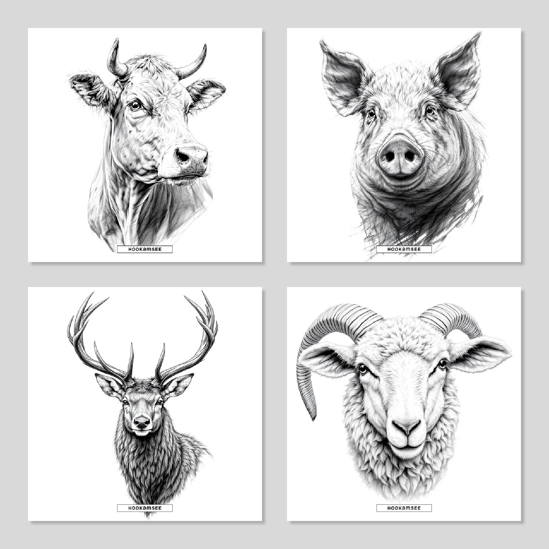 Die FAUNA Serie bringt natürliche Charakterstärke direkt auf deinen Tisch. Vier ikonische Tierporträts – Kuh, Schwein, Schaf und Hirsch – kunstvoll illustriert in feiner Schwarz-Weiß-Strichzeichnung. Jeder Untersetzer zeigt ein eigenes Motiv, präzise ausgearbeitet, detailreich und voller Ausdruck.