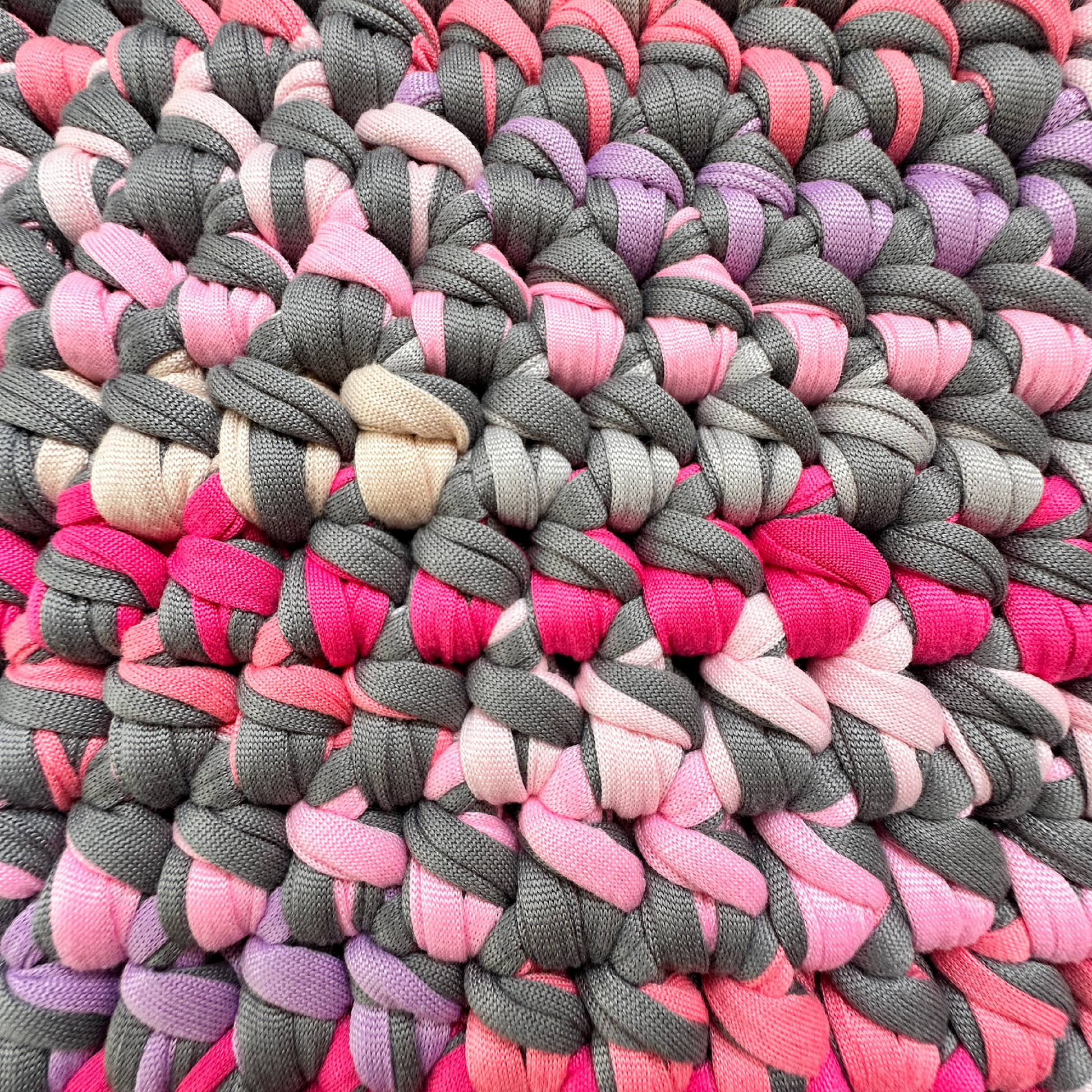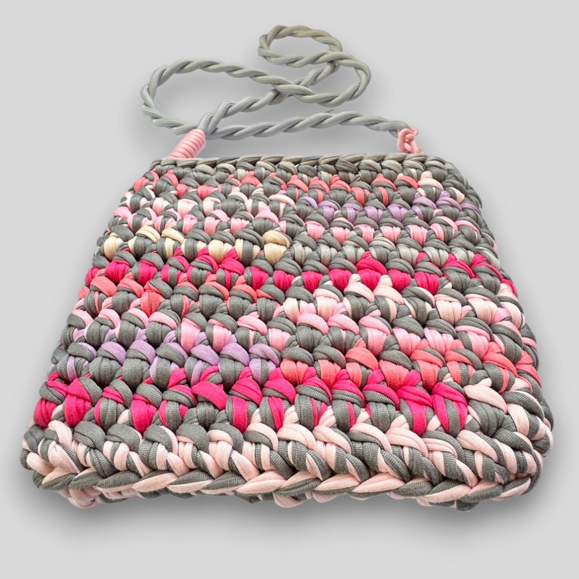 Gefertigt aus doppelt verarbeitetem, recyceltem T-Shirt-Garn entsteht eine stabile und formfeste Struktur mit klarer Silhouette. Das graue Garn bildet die ruhige Basis des Designs und wird durch sanfte Rosatöne und fliederfarbene Nuancen ergänzt, die der Tasche eine elegante Leichtigkeit verleihen.