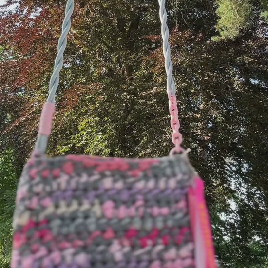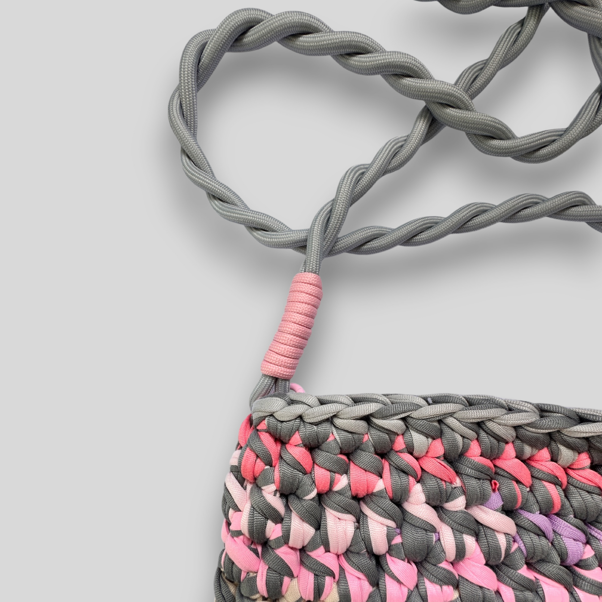 Crossbody Häkeltasche in Grau mit rosa und fliederfarbenen Akzenten