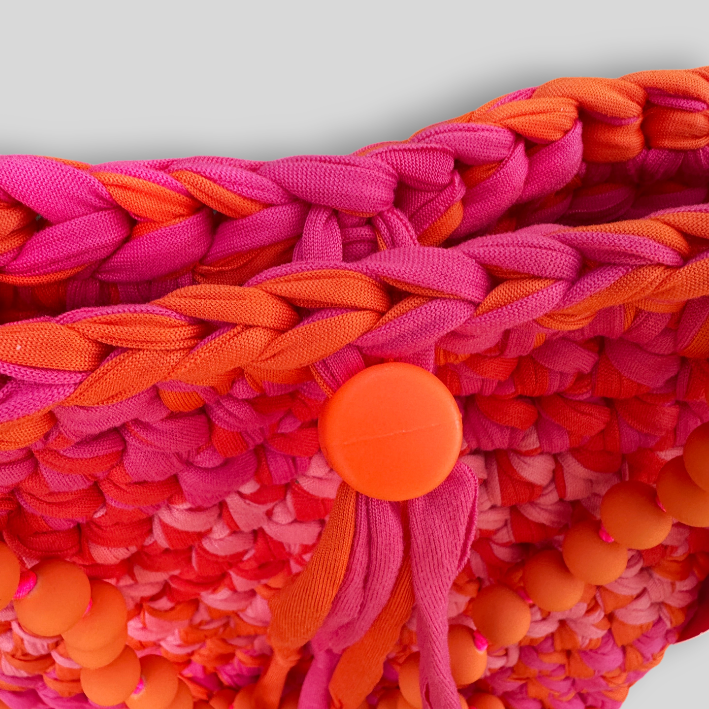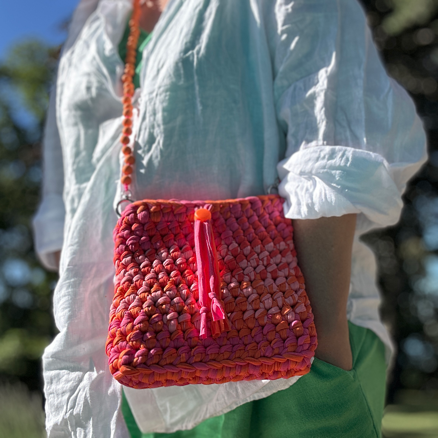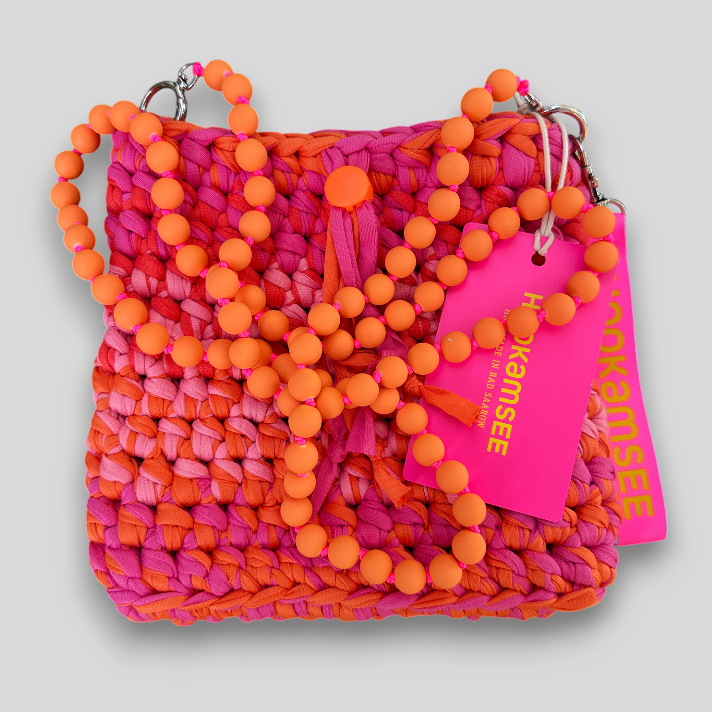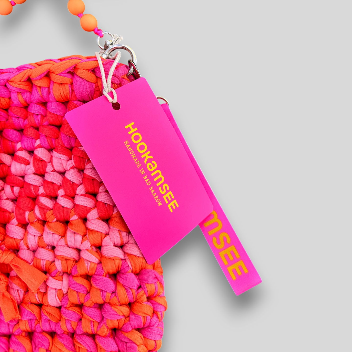 Der Farbverlauf in Pink, Orange und Neonrot macht jede Tasche zum Unikat. Kleine Unregelmäßigkeiten in Maschenbild und Garnstruktur sind materialtypisch und gewollt – sie verleihen jeder HOOK ihren eigenen Charakter.