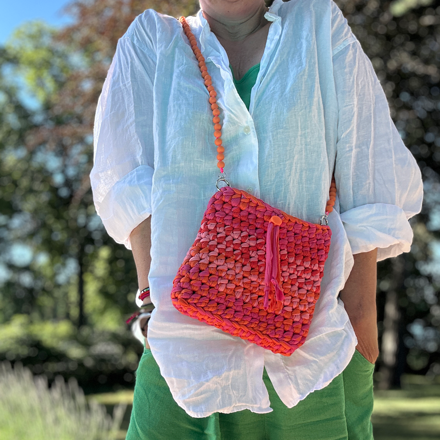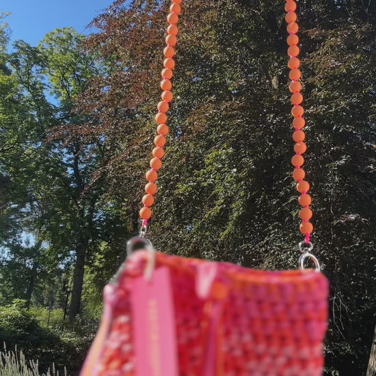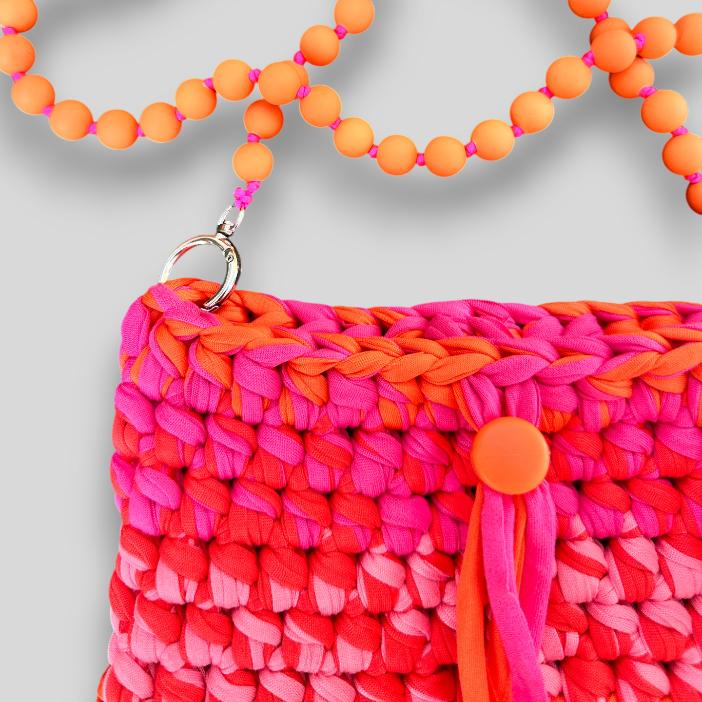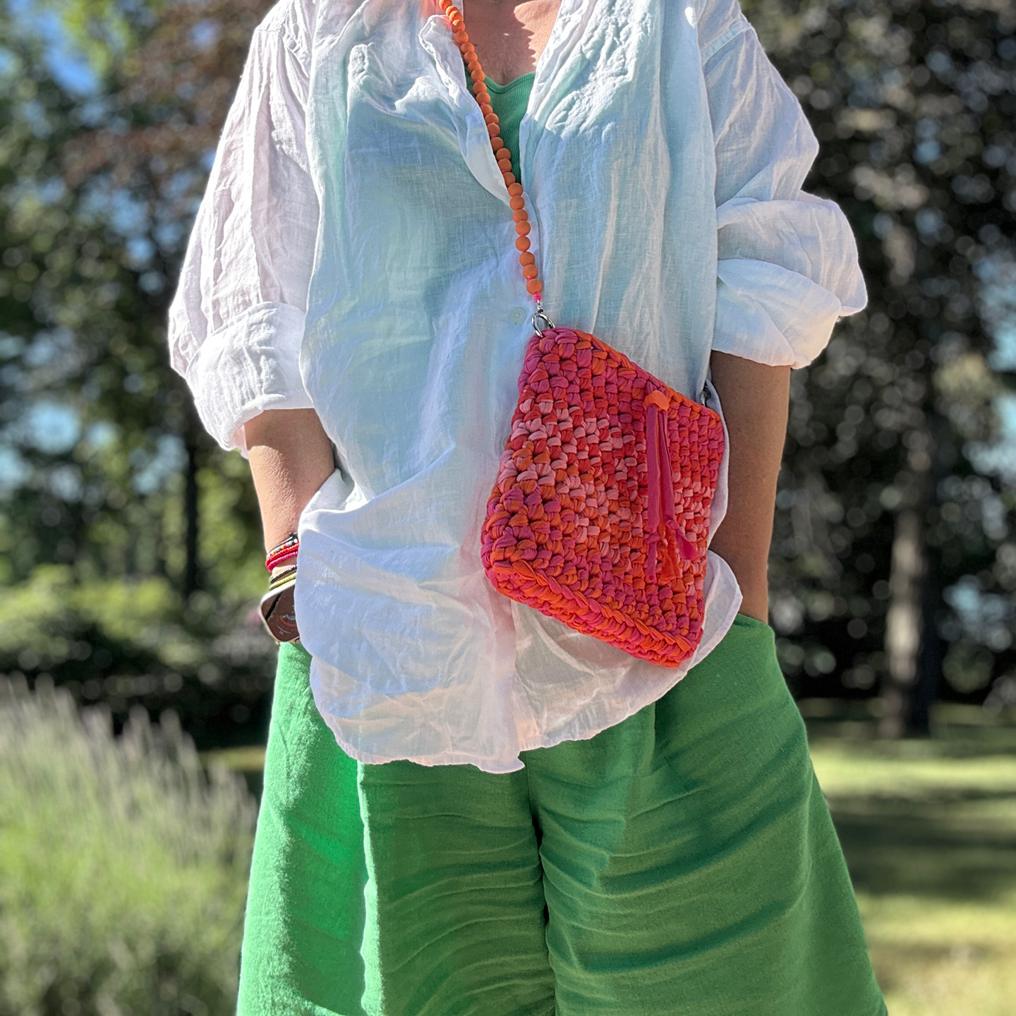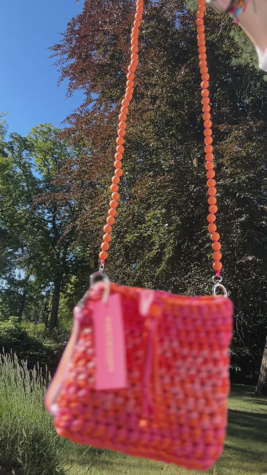 Der Farbverlauf in Pink, Orange und Neonrot macht jede Tasche zum Unikat. Kleine Unregelmäßigkeiten in Maschenbild und Garnstruktur sind materialtypisch und gewollt – sie verleihen jeder HOOK ihren eigenen Charakter.