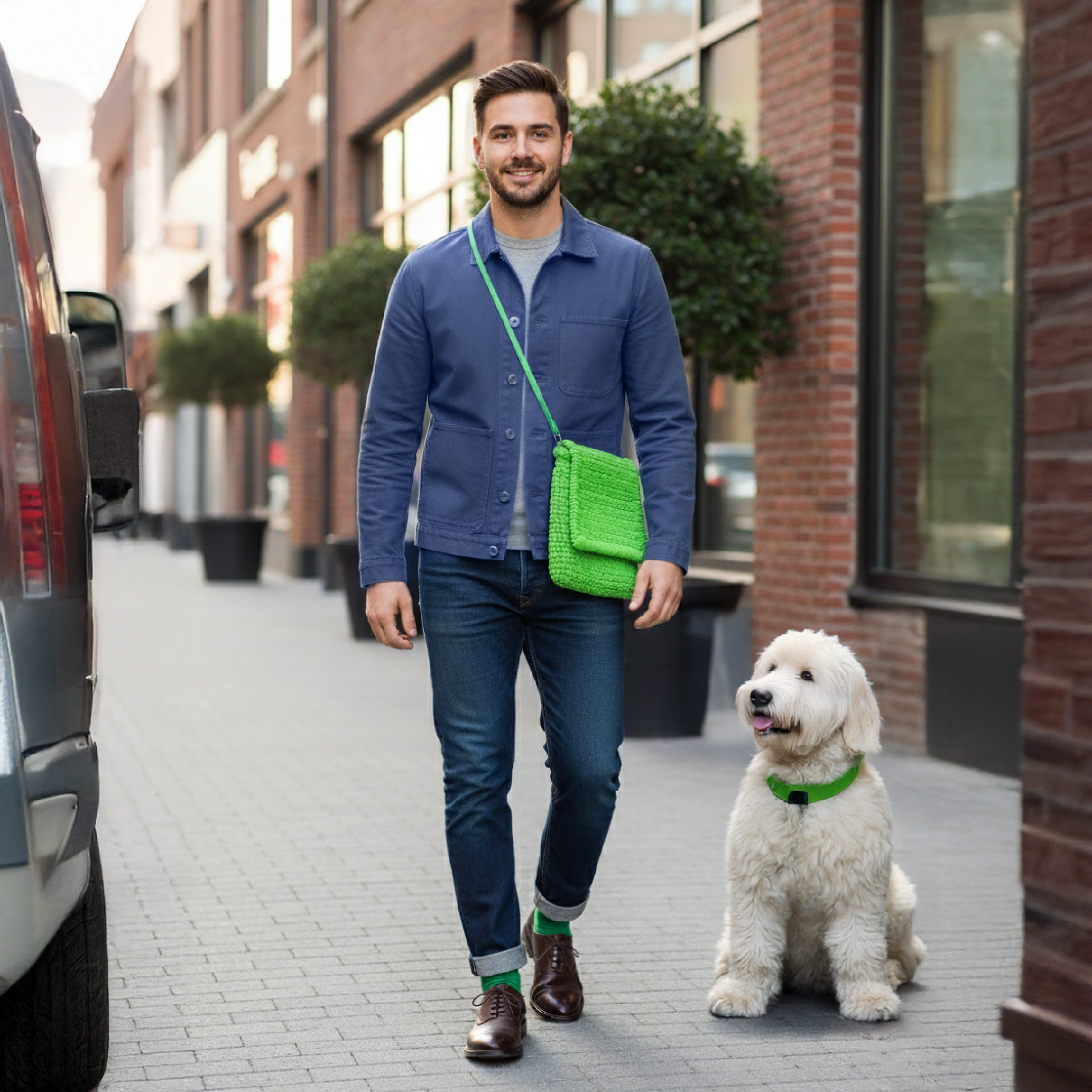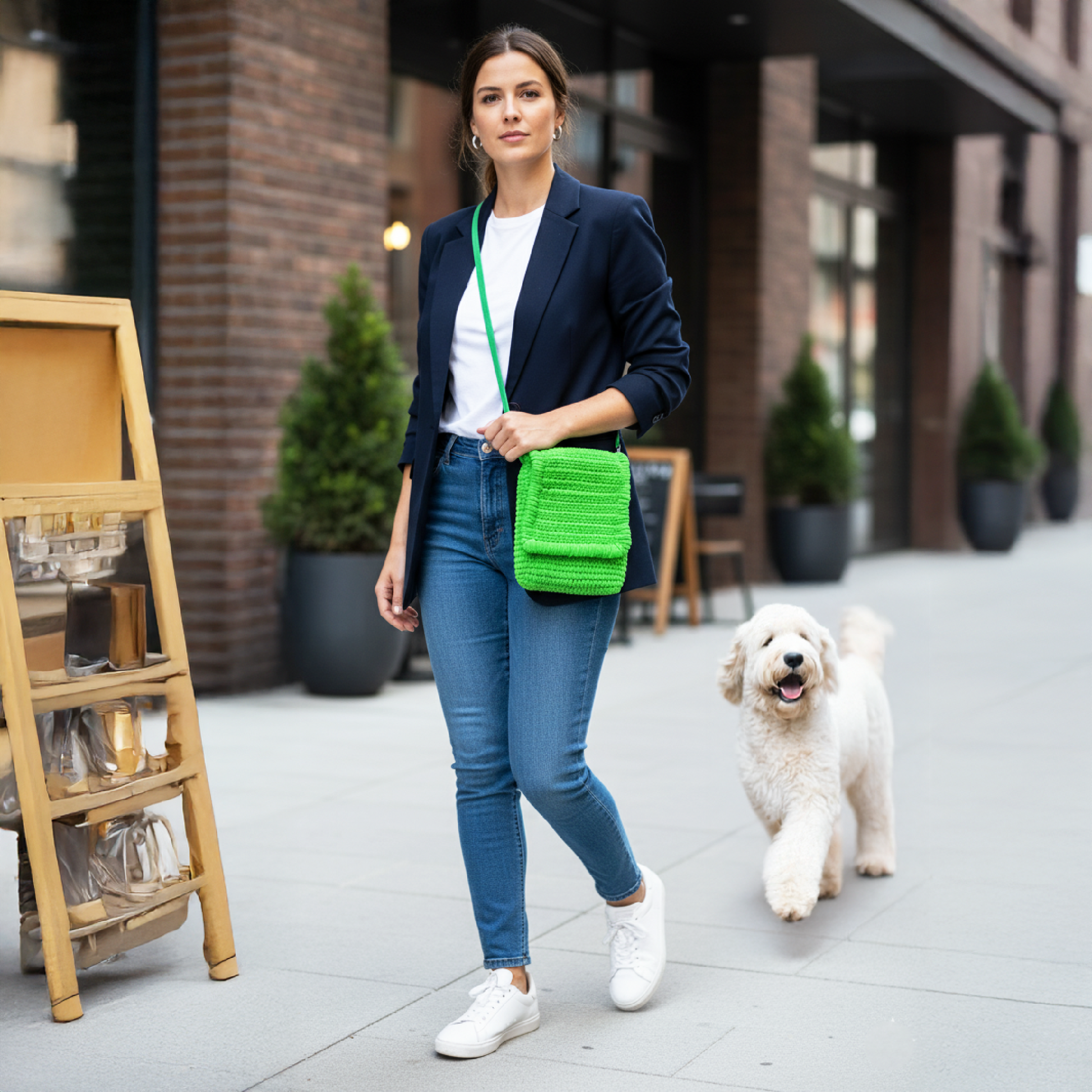 Mit ca. 25 cm Breite und ca. 30 cm Höhe bietet sie genug Platz für Smartphone, Schlüssel, Portemonnaie oder kleine Essentials – ideal für Stadt, Büro oder Spaziergang. Der grüne Ledergurt ist längenverstellbar und sorgt für hohen Tragekomfort – ob quer oder über der Schulter getragen.