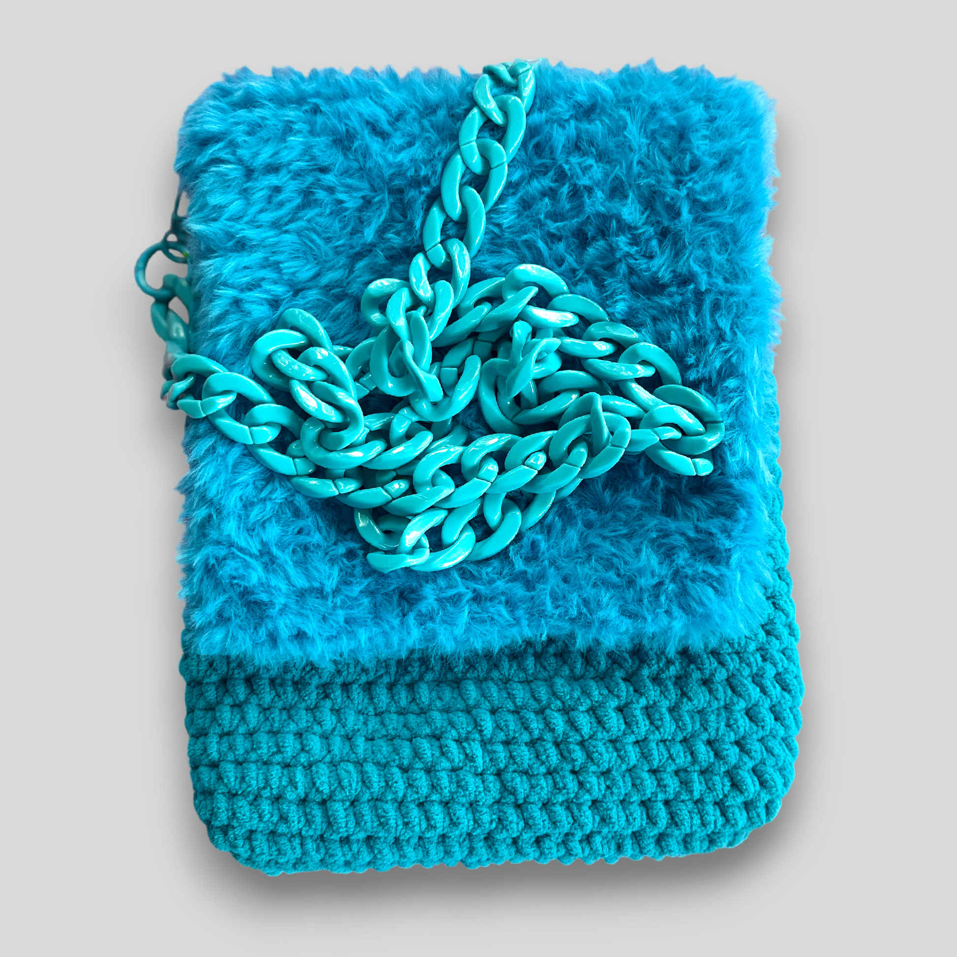 Diese Tasche vereint leuchtendes Türkisblau mit einer flauschigen Kunstfellklappe und einem farblich abgestimmten Kettengurt – ein Statement-Piece, das sofort auffällt.