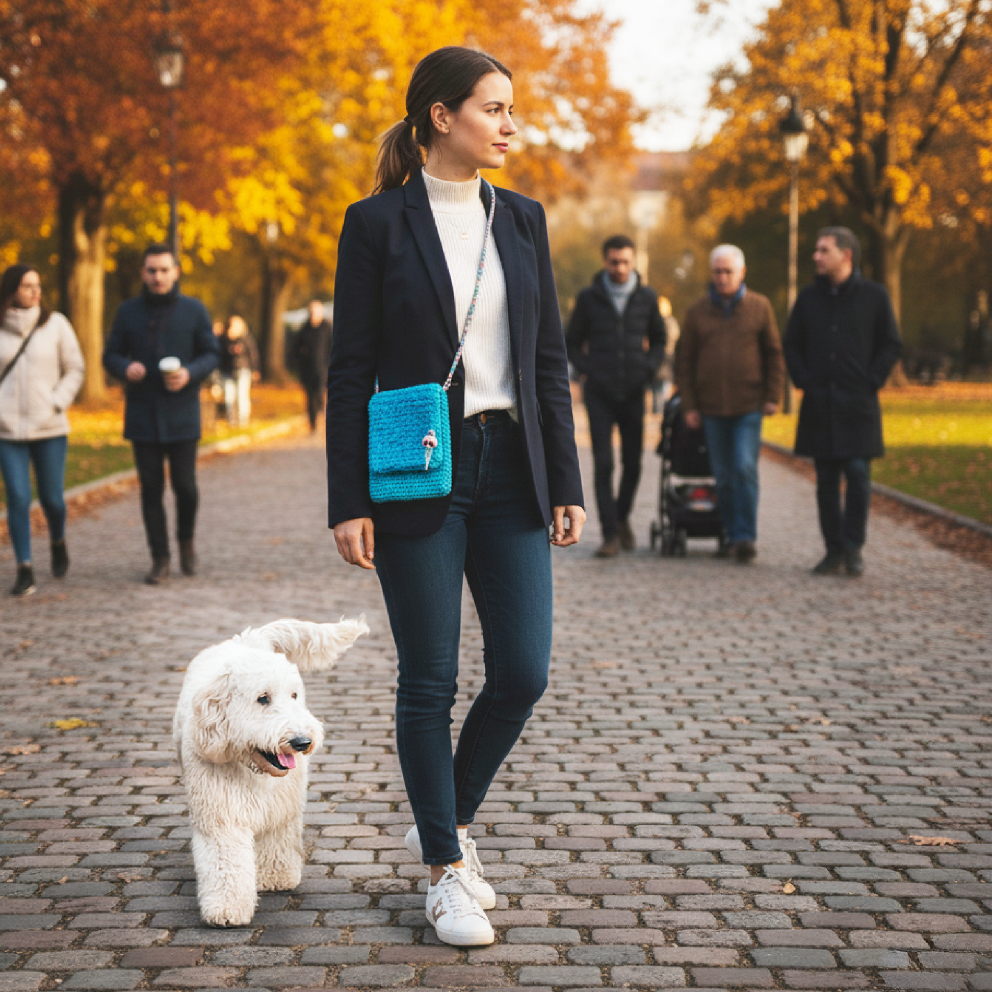 Der runde, farbenfrohe Taschengurt liegt angenehm auf der Schulter und unterstreicht den modernen Stil. Die abnehmbare Anstecknadel mit Strickmütze und Sonnenbrille sorgt für einen verspielten Twist – ein Detail, das jede Tasche zum Unikat macht.