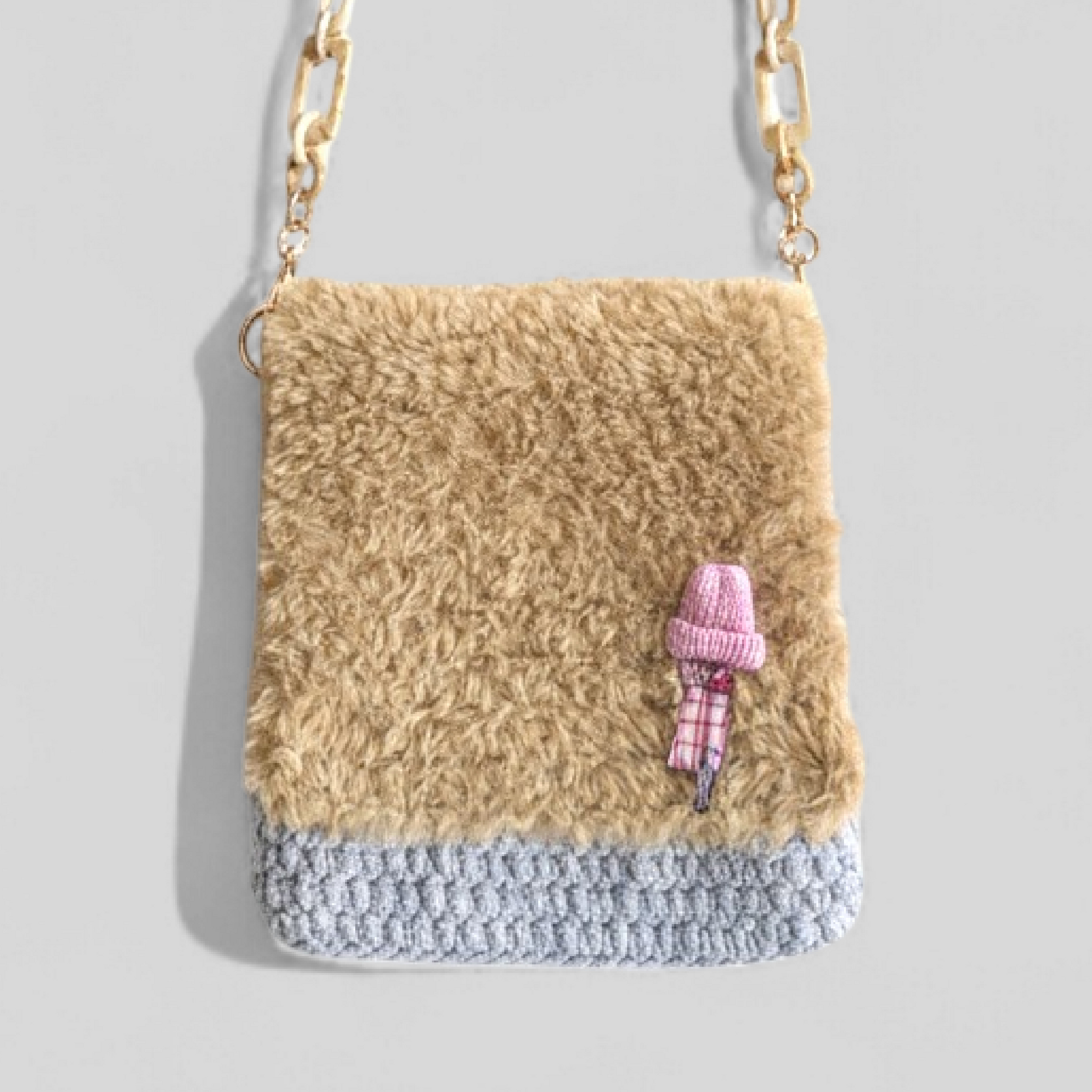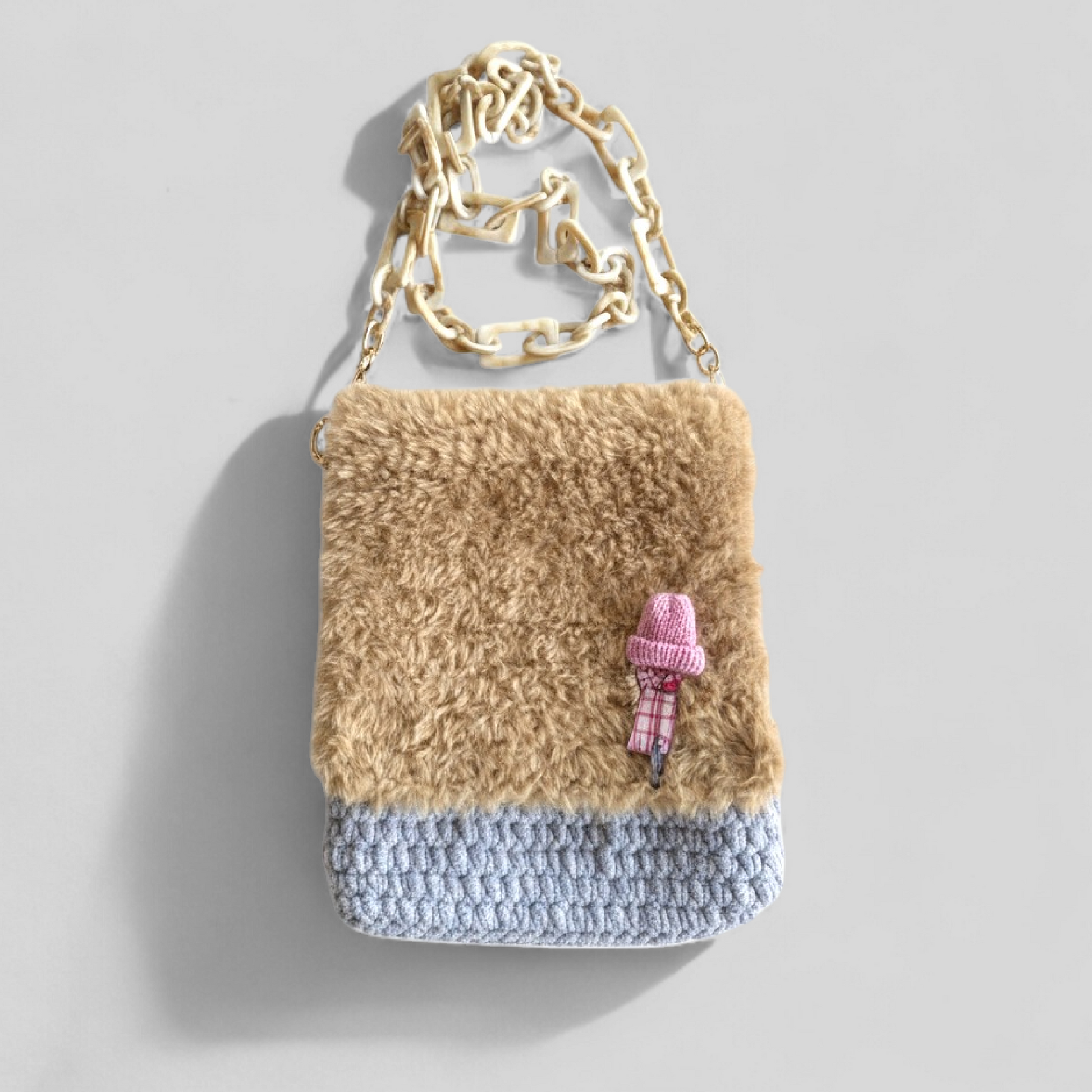 Weich, modern und mit einem Hauch verspieltem Charme – HOOK #142 kombiniert flauschiges Kunstfell in warmem Sandton mit gehäkeltem Samtgarn in hellem Fliederblau.