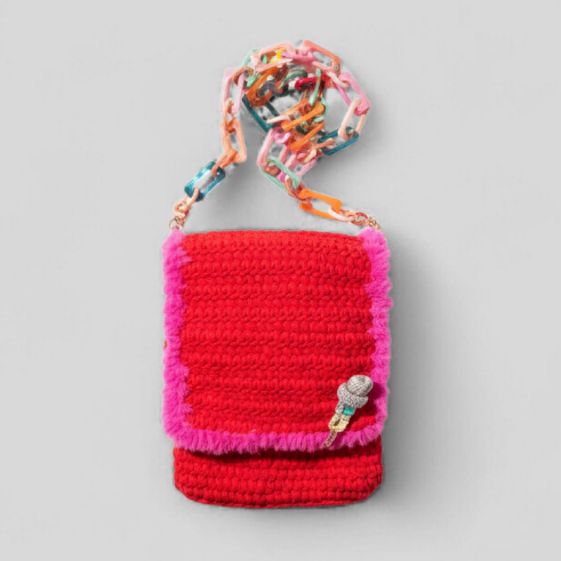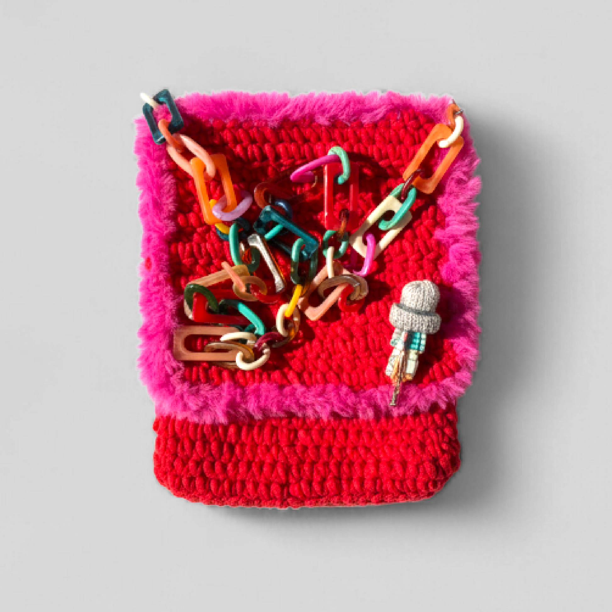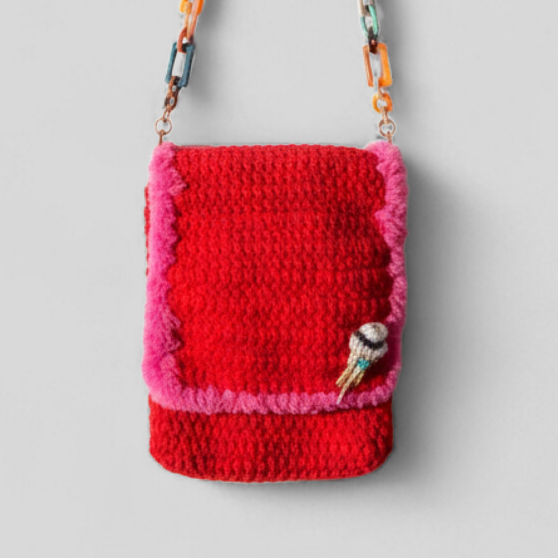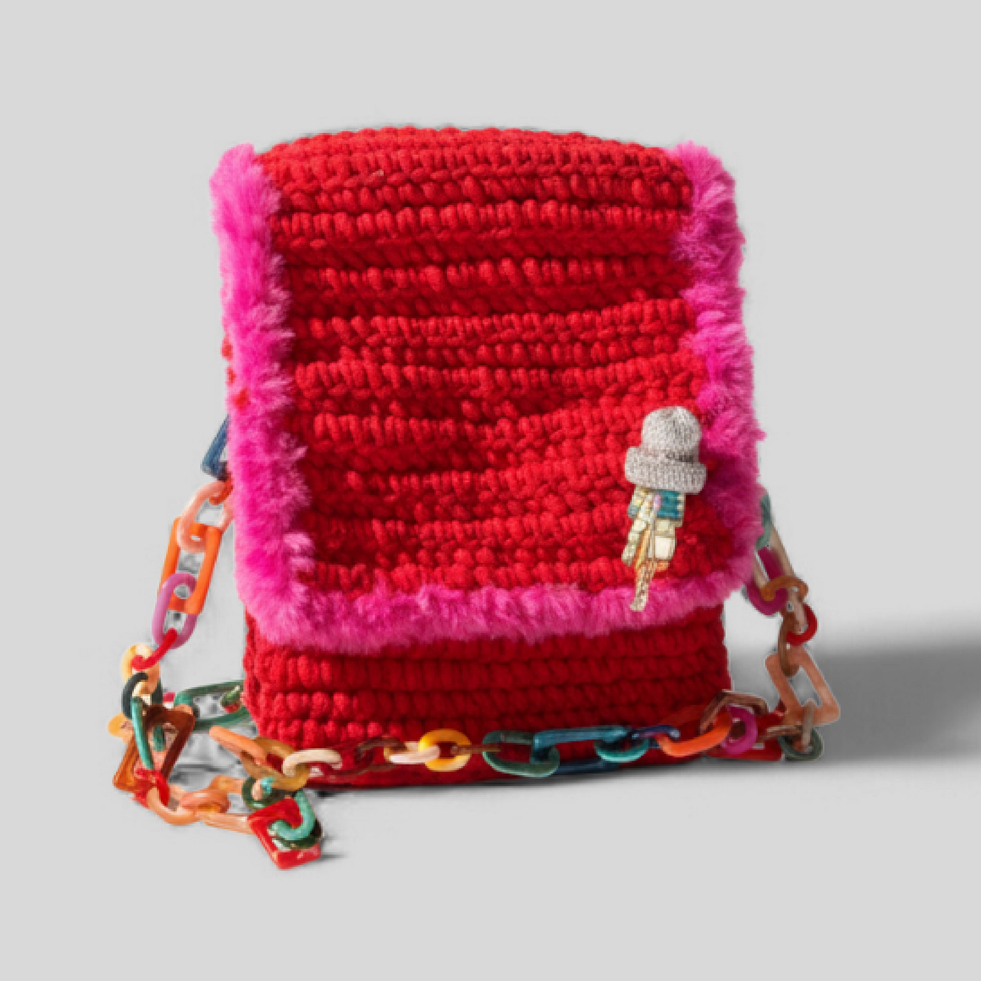 Der bunte Acrylkettengurt verleiht ihr eine moderne, verspielte Note und sorgt gleichzeitig für Stabilität und Komfort. Die Ansteckfigur – ein kleiner Wintercharakter mit Mütze, Mantel und Schal – unterstreicht den humorvollen, individuellen Stil der Tasche.