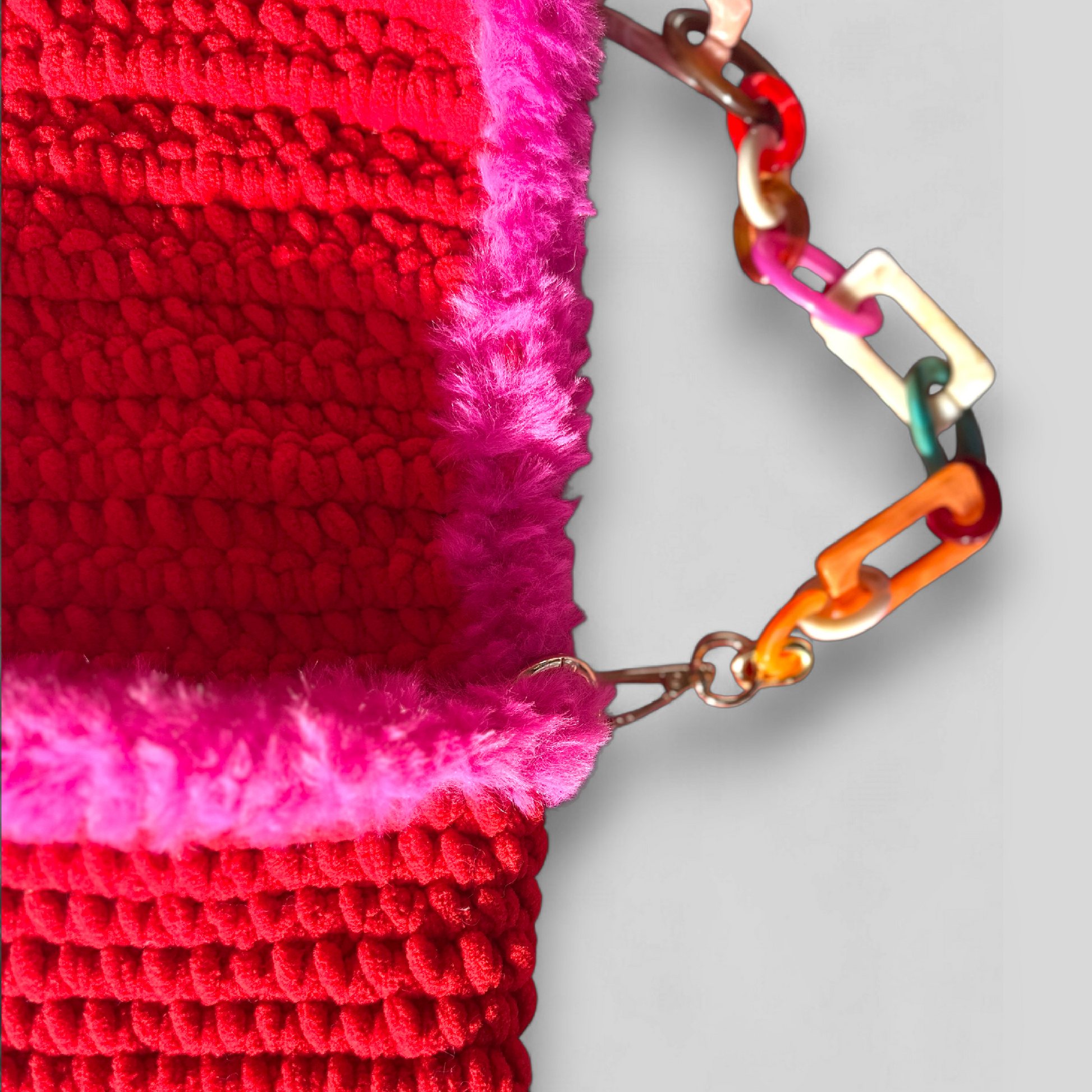 HOOK #143 bringt Farbe, Energie und Mut ins Spiel – ein echtes Statement aus kräftigem Rot, eingefasst von einem leuchtenden Pinkrand aus flauschigem Kunstfell.