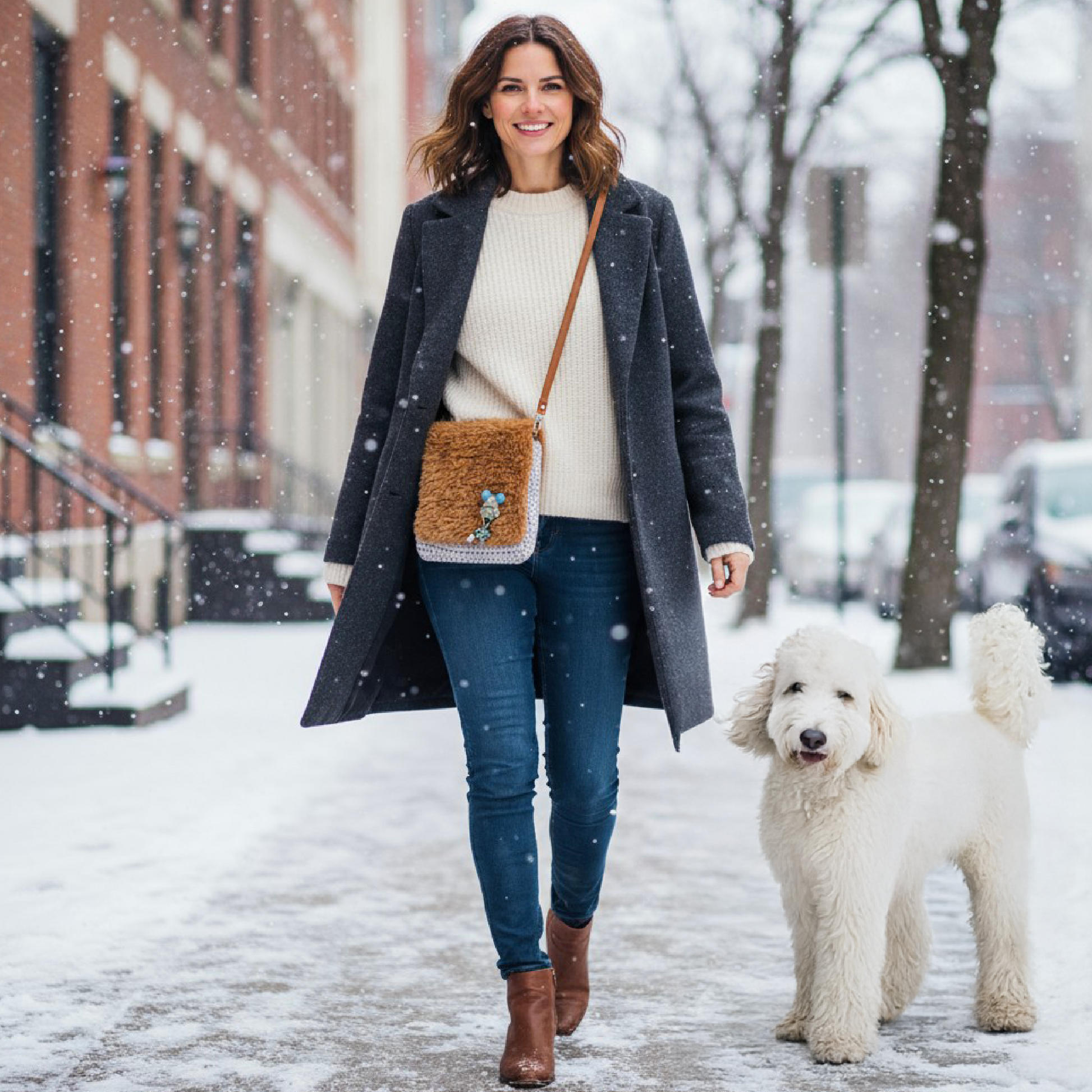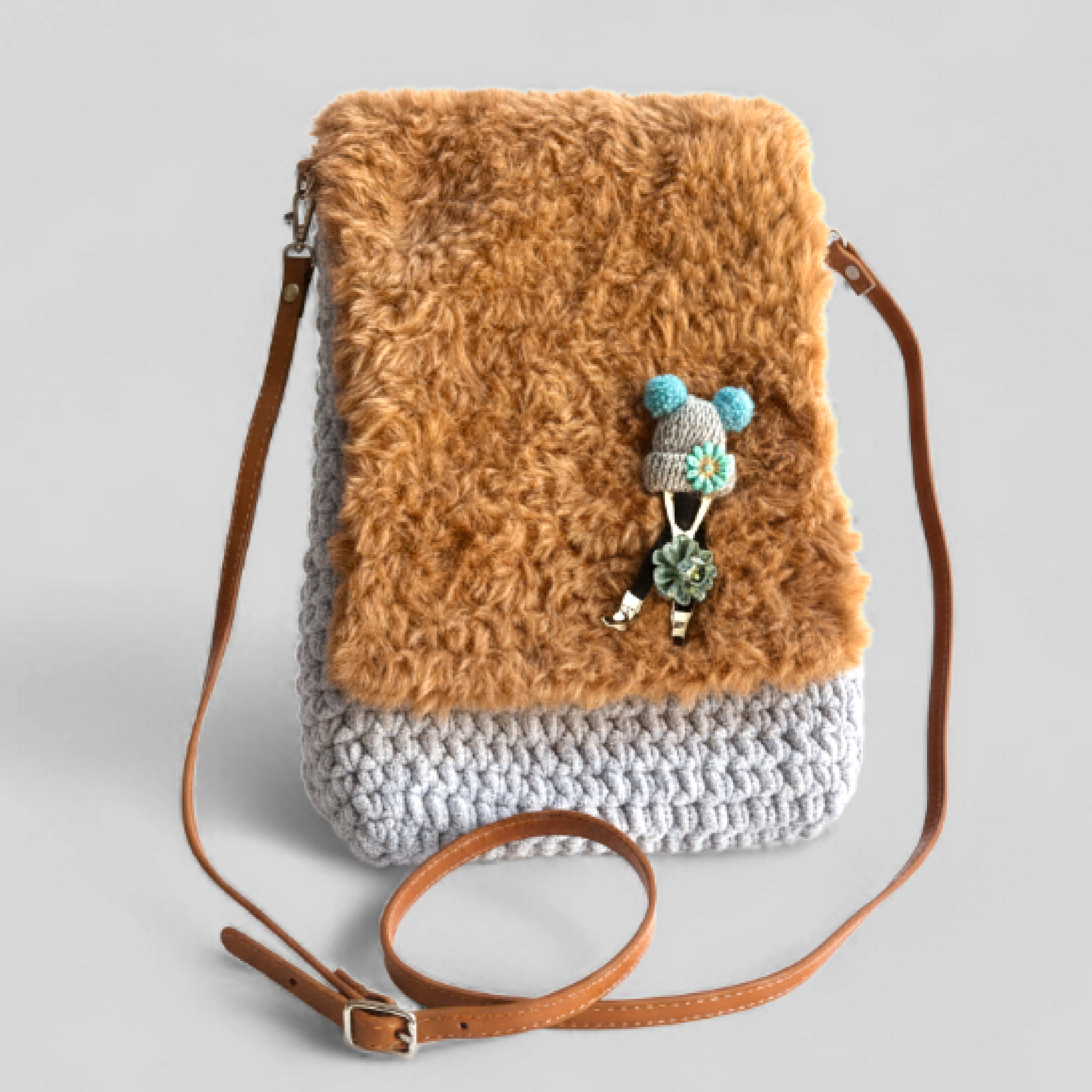 Der verstellbare Kunstledergurt sorgt für Komfort und Flexibilität, während die kleine Ansteckfigur mit Mütze und Blume einen charmanten Akzent setzt. Ob beim Spaziergang durch die Stadt oder im Winterurlaub – diese Tasche begleitet dich mit natürlicher Eleganz und einer Portion Individualität.