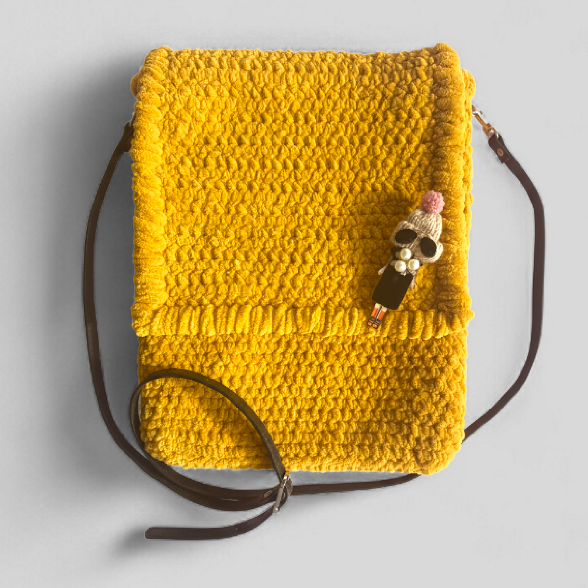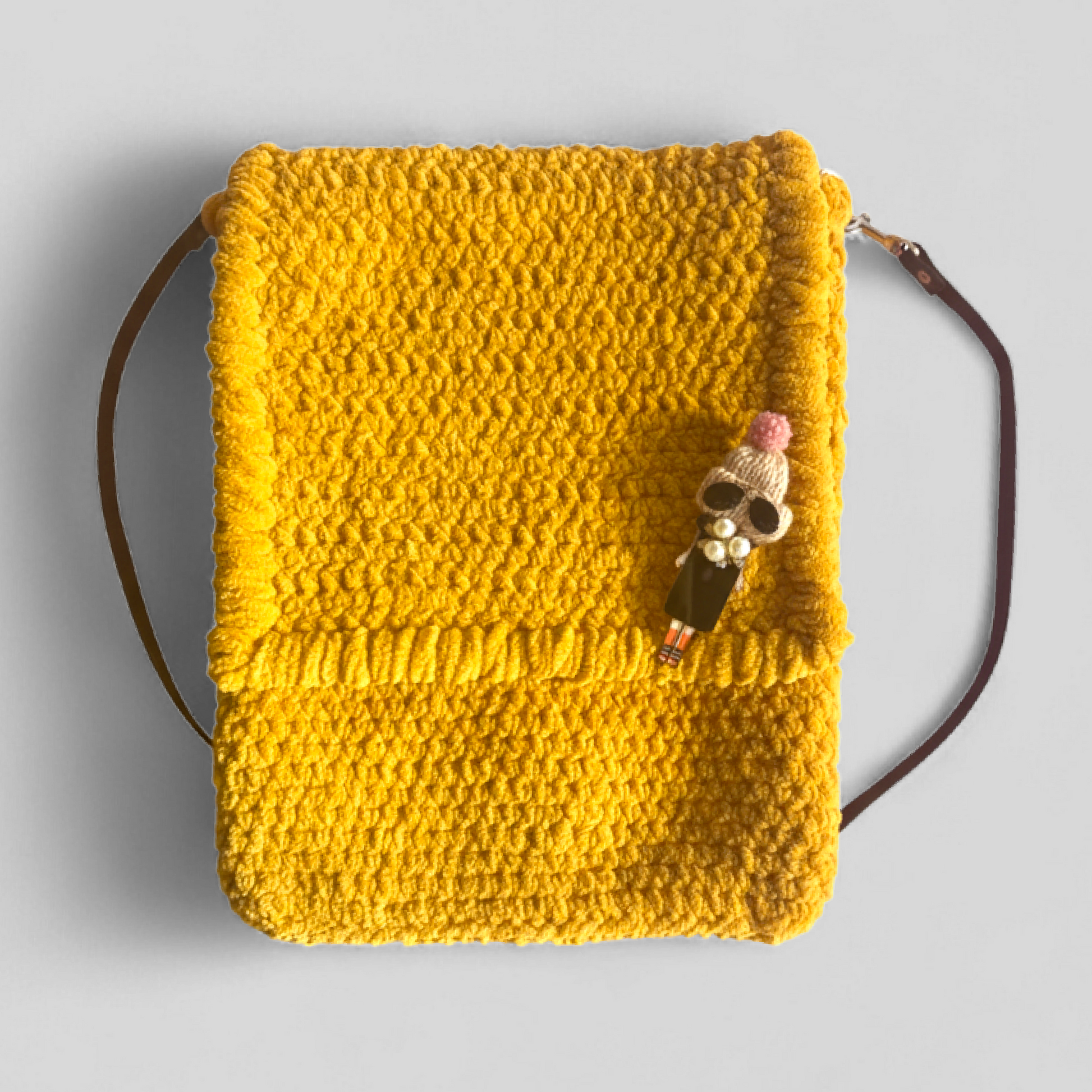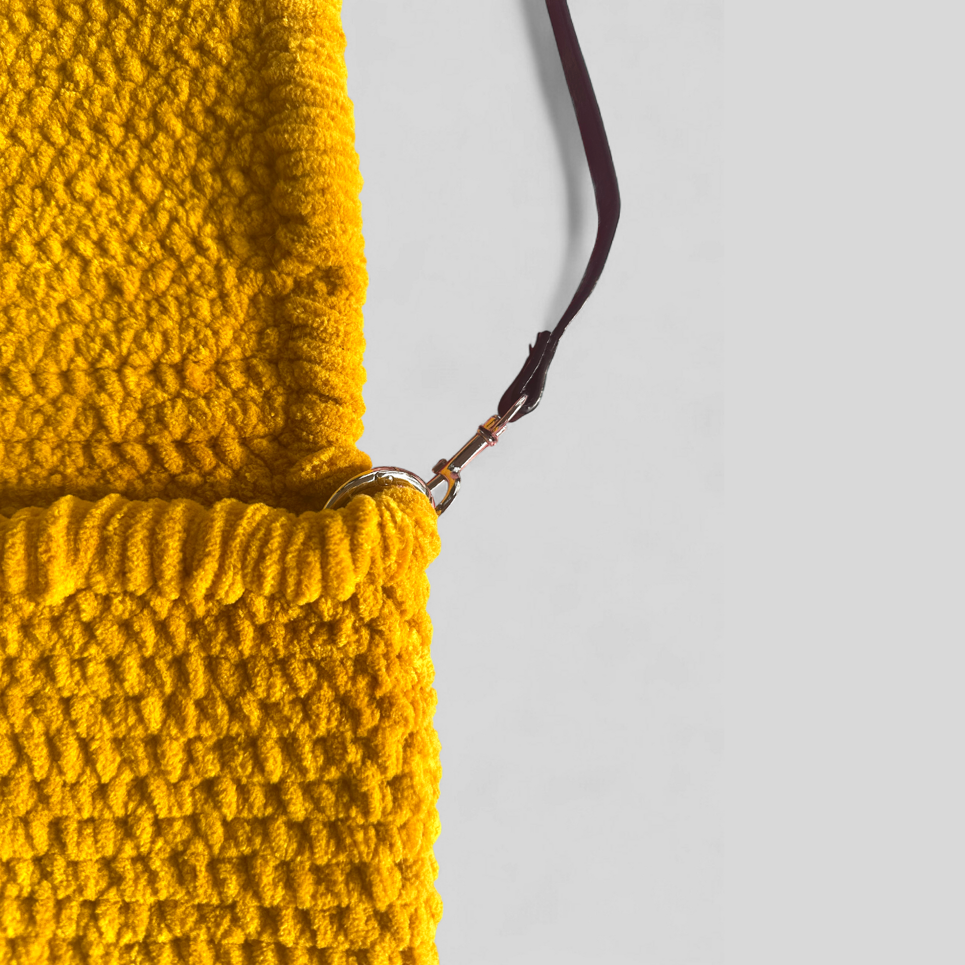 HOOK #145 erstrahlt in sattem Curry – modern, erdig und doch leuchtend. Das fein gehäkelte Samtgarn verleiht der Tasche ihre weiche Struktur und einen stilvollen, handgearbeiteten Look.