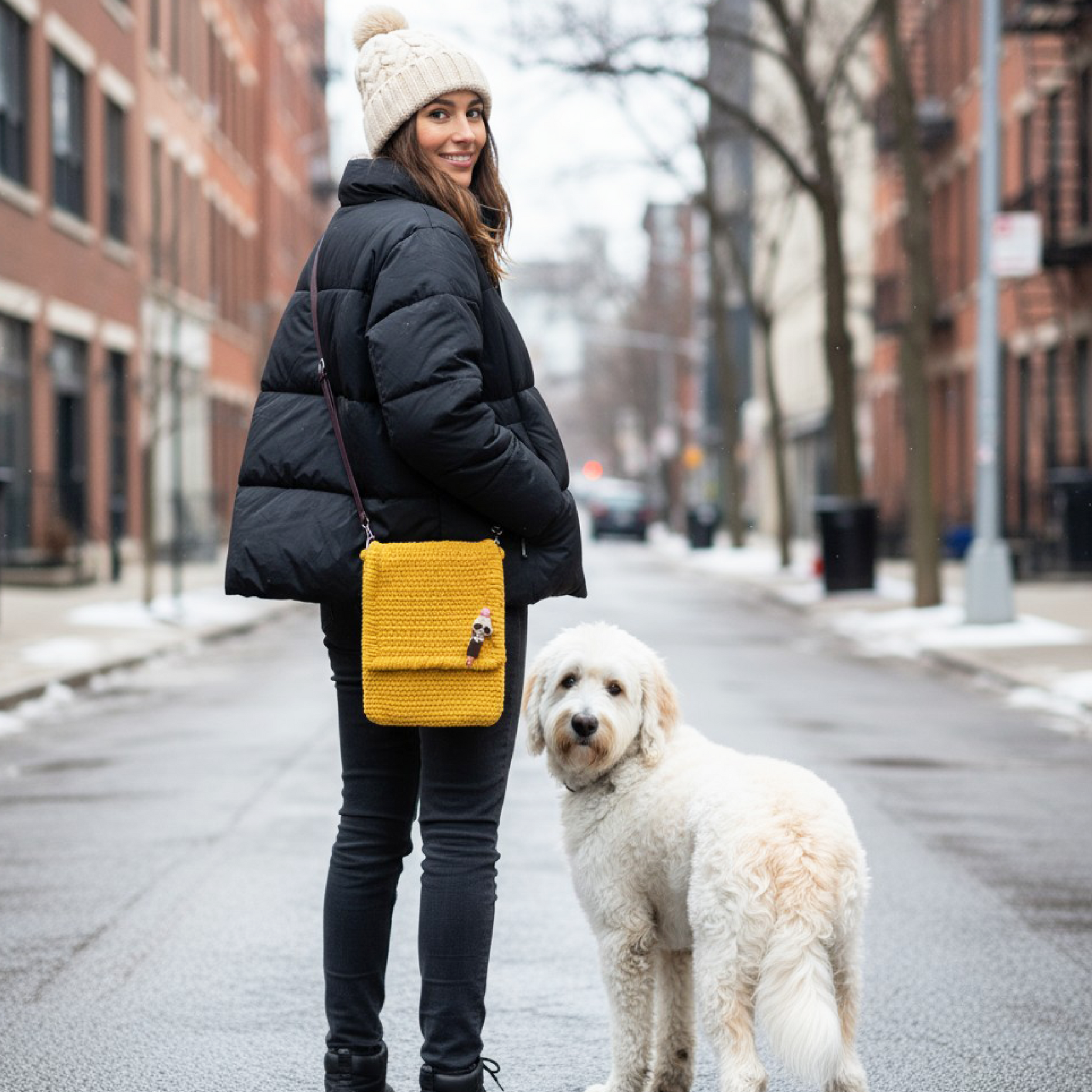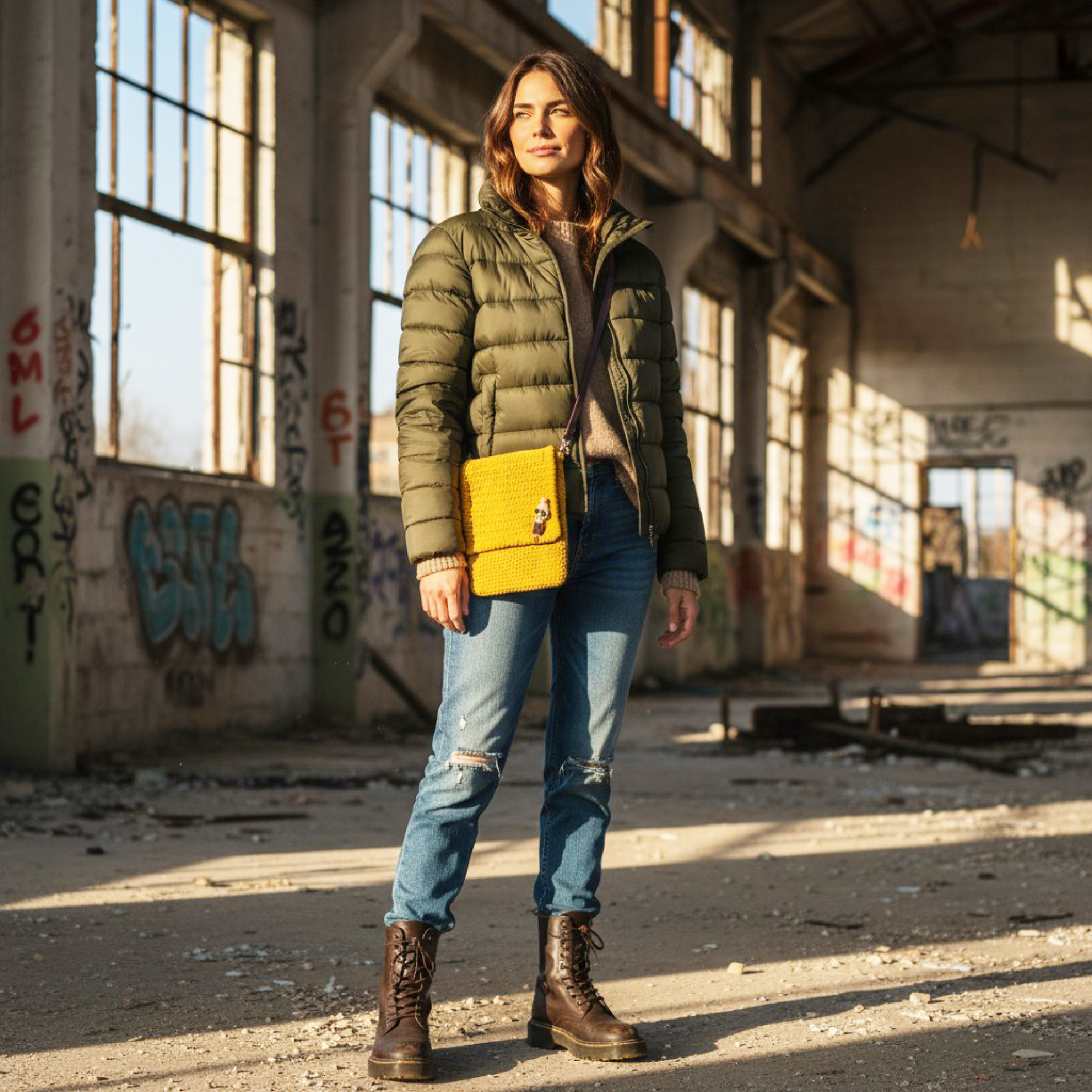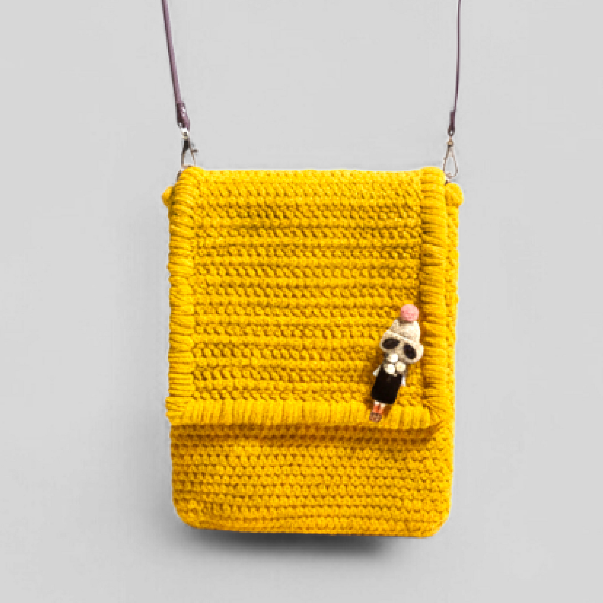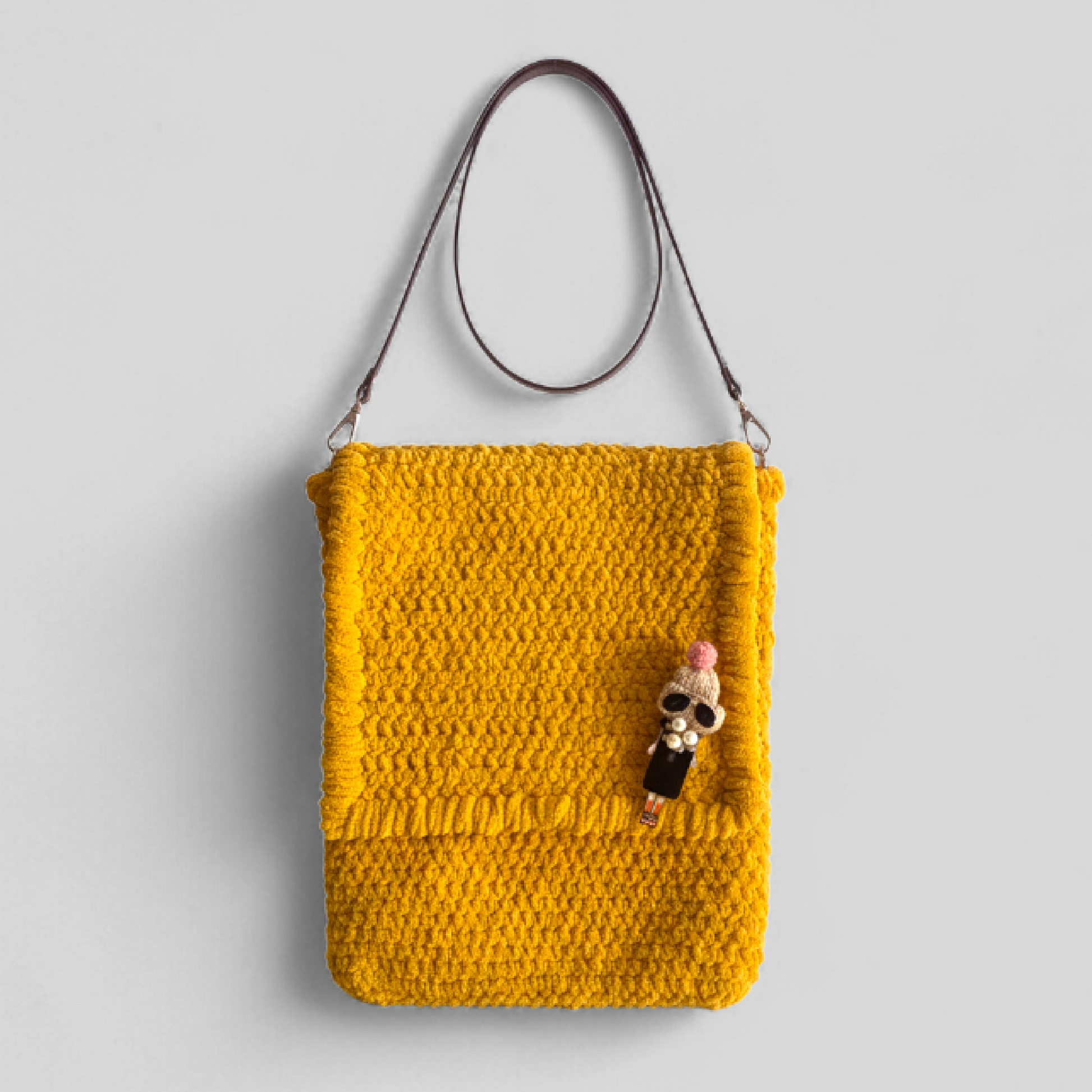 HOOK #145 erstrahlt in sattem Curry – modern, erdig und doch leuchtend. Das fein gehäkelte Samtgarn verleiht der Tasche ihre weiche Struktur und einen stilvollen, handgearbeiteten Look.