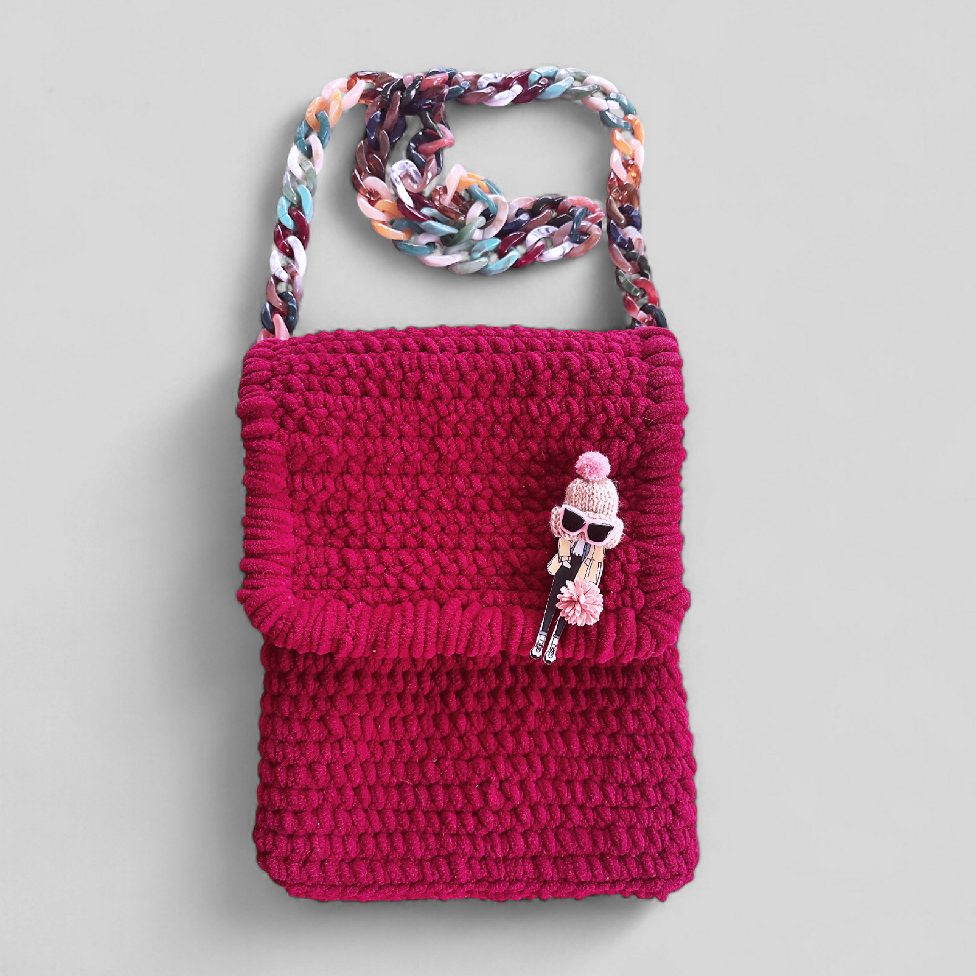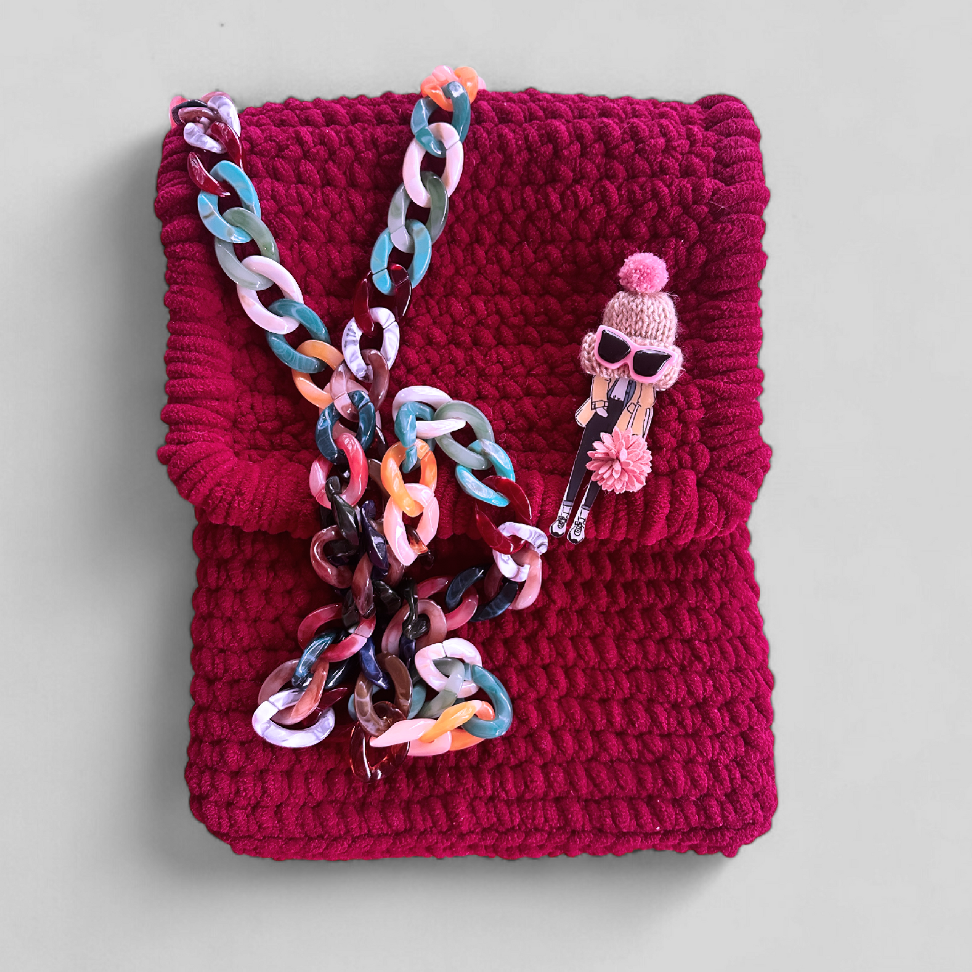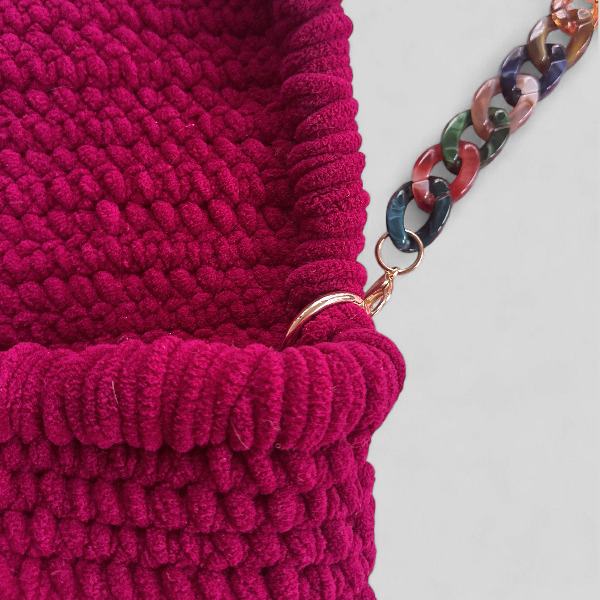 HOOK #146 vereint kräftiges Beerenrot mit der weichen Struktur von Samtgarn – warm, markant und stilvoll zugleich. Der bunte Acryl-Kettengurt setzt ein modernes, verspieltes Highlight und schmiegt sich angenehm über die Schulter.