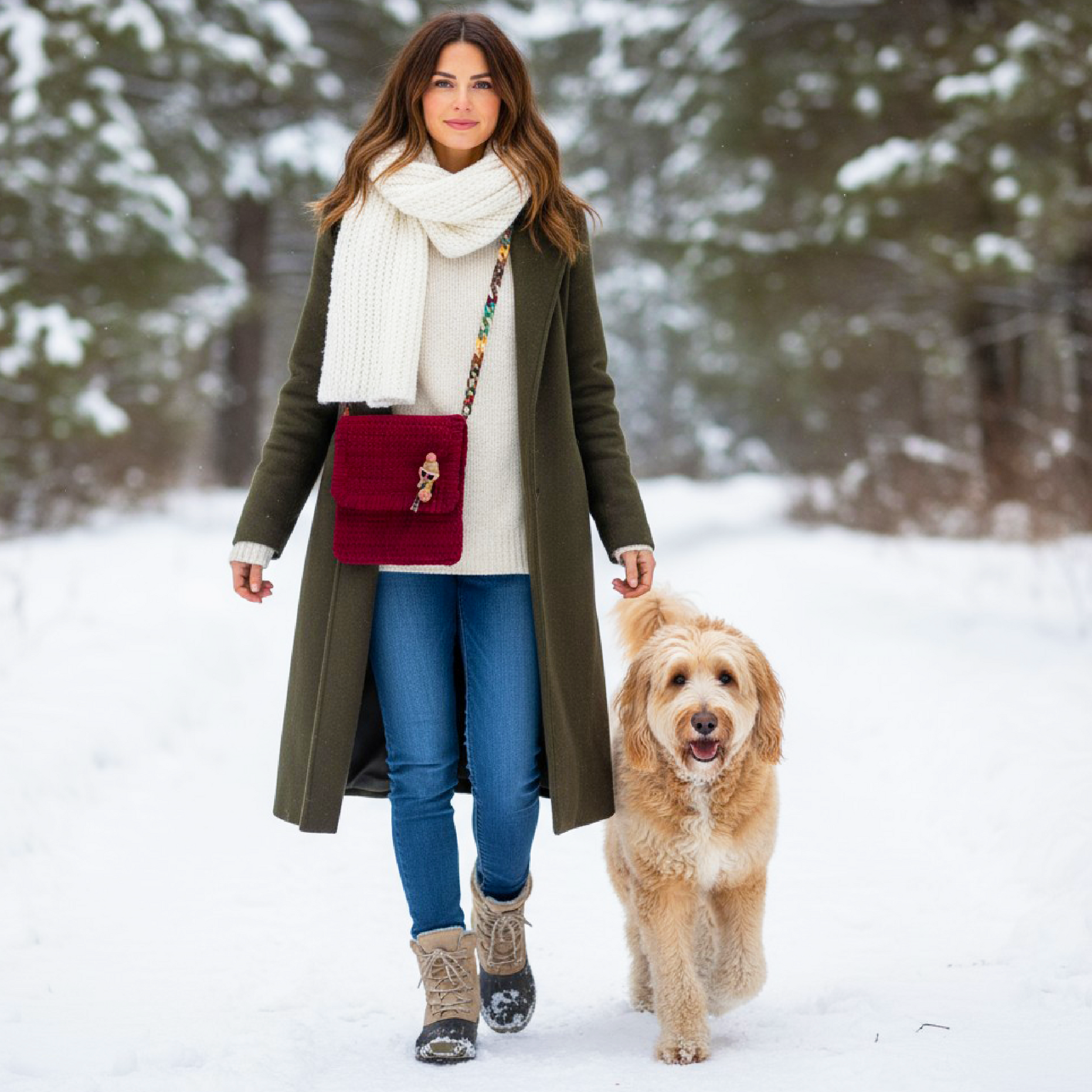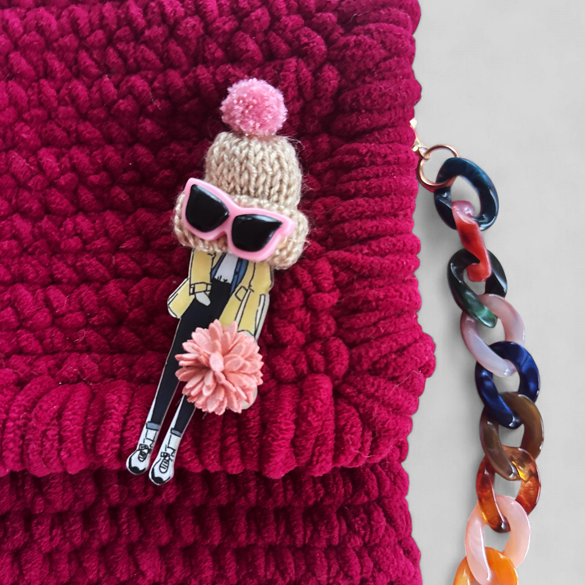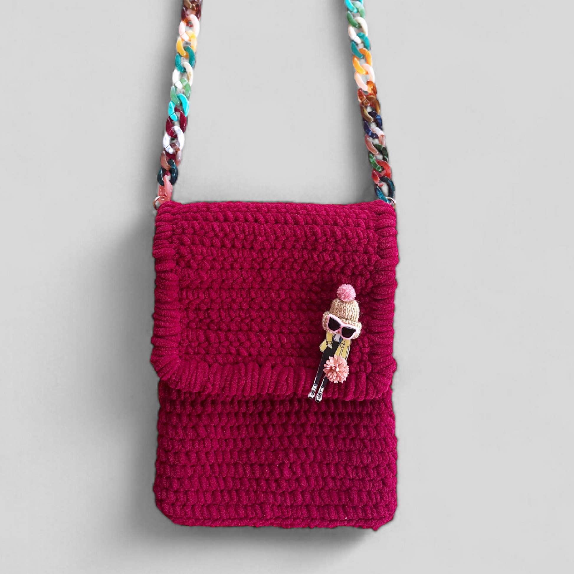 HOOK #146 vereint kräftiges Beerenrot mit der weichen Struktur von Samtgarn – warm, markant und stilvoll zugleich. Der bunte Acryl-Kettengurt setzt ein modernes, verspieltes Highlight und schmiegt sich angenehm über die Schulter.
