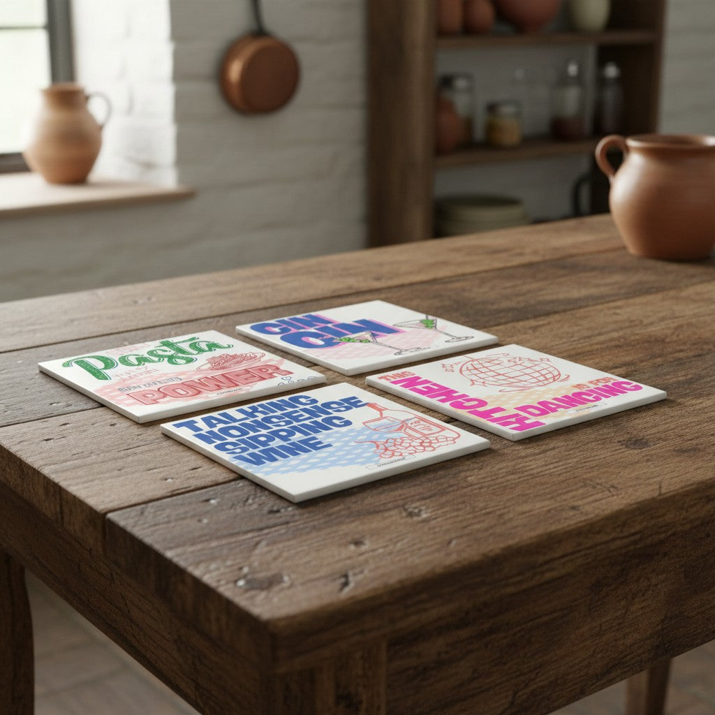 Jedes Motiv bringt eine eigene Note an den Tisch – von italienischer Lebensfreude über Aperitivo-Stimmung bis hin zu modernem Küchenhumor. Kraftvolle Typografie trifft auf illustrative Elemente und macht die Untersetzer zu kleinen Designstatements, die Getränke stilvoll begleiten und gleichzeitig Oberflächen schützen.