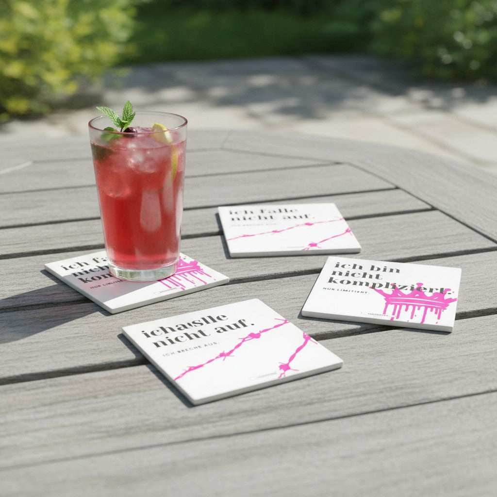 Die TRUE TALK Serie bringt klare Worte und charakterstarkes Design direkt auf deinen Tisch: Vier moderne Spruchmotive – mutig, pointiert und stilvoll – vereint in einem hochwertigen 4er-Set. Jedes Motiv wird brillant auf glänzende Keramik gedruckt und macht jeden Untersetzer zu einem kleinen Statement-Piece mit Haltung.